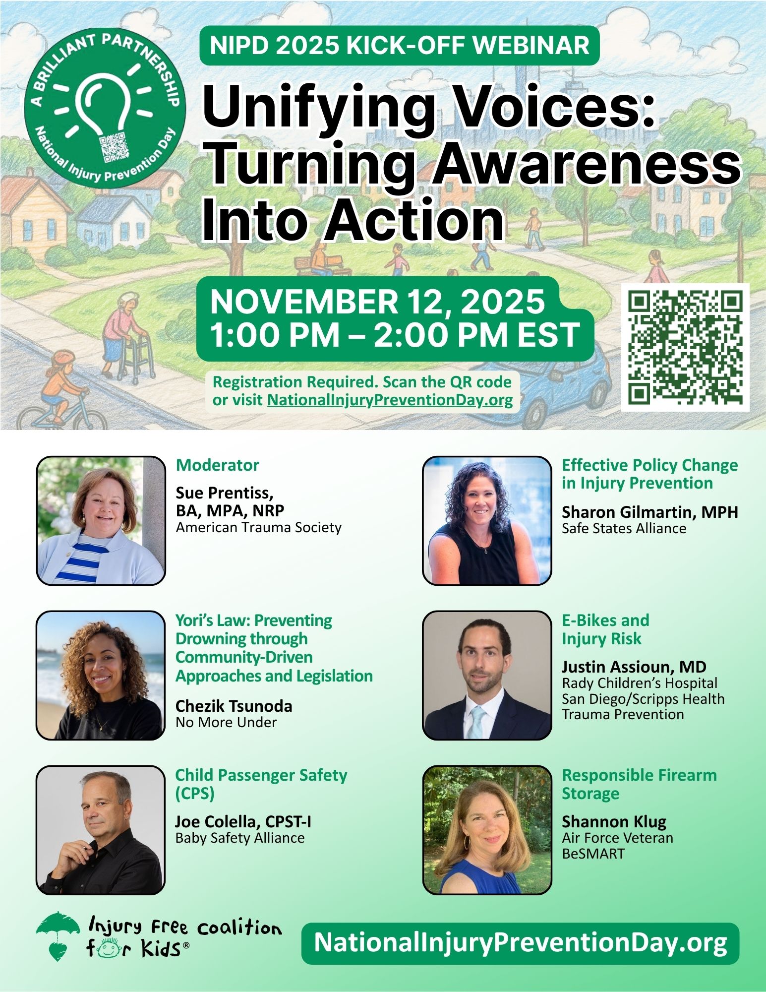 Unifying Voices: Turning Awareness into Action Wenesdsay, November 12, 2025 1:00 – 2:00 PM EST The National Injury Prevention Day (NIPD) partners invite you to kick off this impactful day with a dynamic, multi-perspective webinar focused on the power of advocacy and education in preventing injuries and saving lives. The diverse panel of experts of parent advocates, community educators, physicians and injury and violence prevention advocates will share their unique insights and actionable strategies to build safer environments for all. Don't miss this opportunity to be part of the movement for injury prevention and community safety. Join us November 12th! Join injury prevention experts, healthcare professionals, community leaders, and advocates from across the nation for this engaging webinar. The webinar will start at 1:00 PM EST, and last for about an hour. Pre-registration is required.